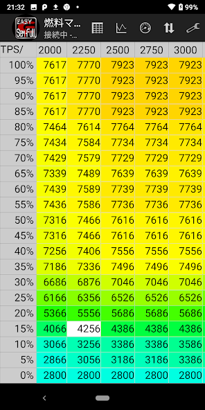 - Exiba a velocidade atual do motor e a posição do acelerador em tempo real no mapa de ajuste de combustível e ignição.